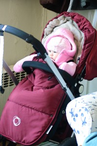 This week, she moved into her crib. That means the frame from the bassinet is free to make a seat on the stroller. (She was sitting on a car seat before). Finally, she can sit in a real Bugaboo stroller. Look she is very comfortable there and she is well wrapped for the deep cold winter.